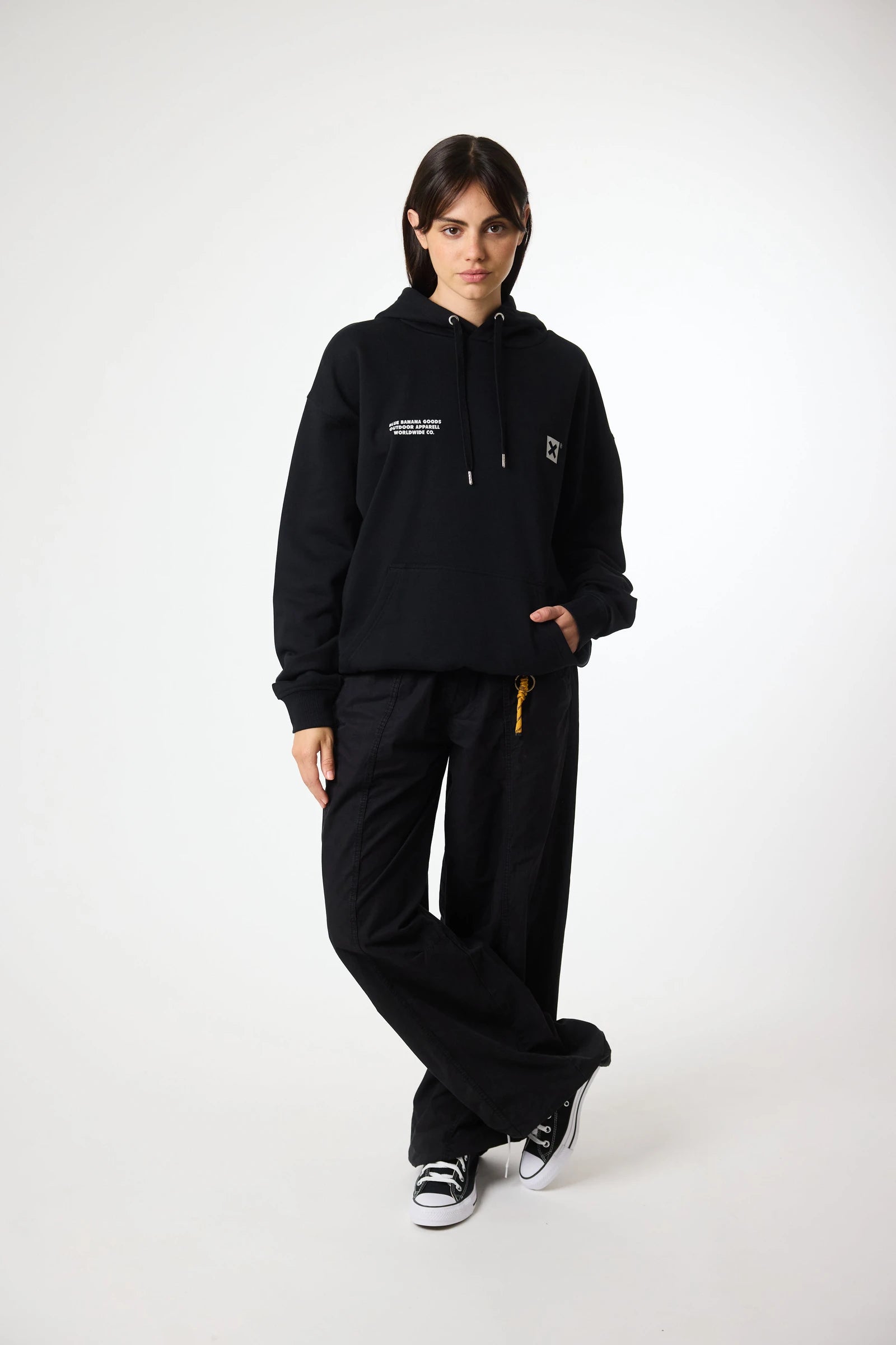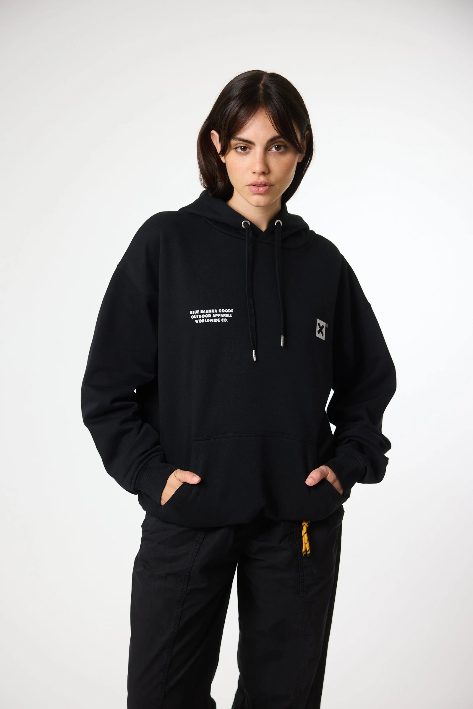 Hoodie with front print on the upper left side and centered back print. Front lower central pocket with openings on both sides. Made of 100% organic cotton and oversized fit.