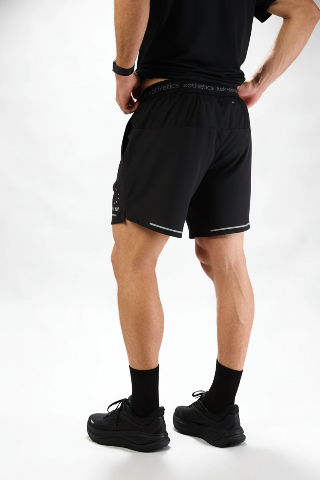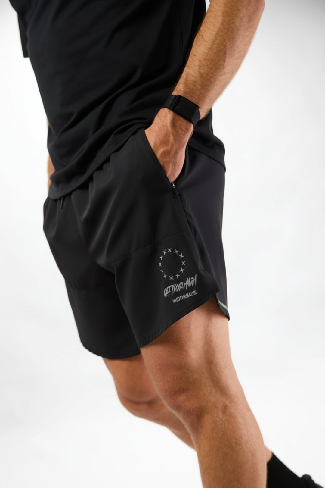 Short sports pants made from 100% recycled polyester. Featuring side front pockets with zipper closure. Reflective logo on the lower left front and lower right back. 3 cm side slit at the hem and adjustable drawstring closure at the waist. A centered back top pocket.