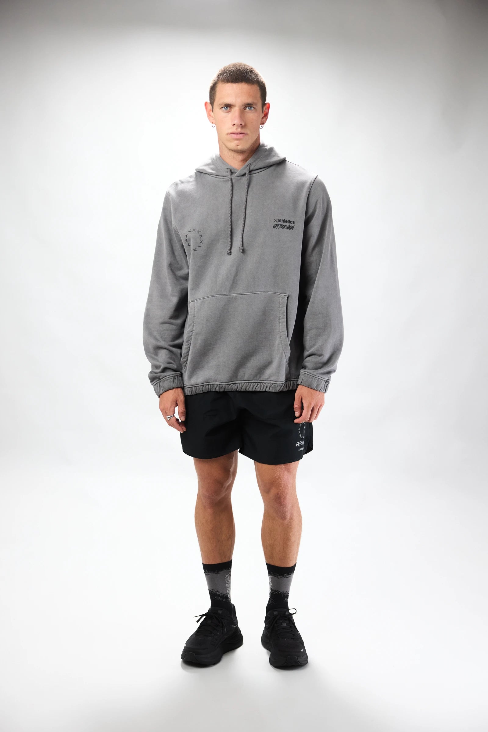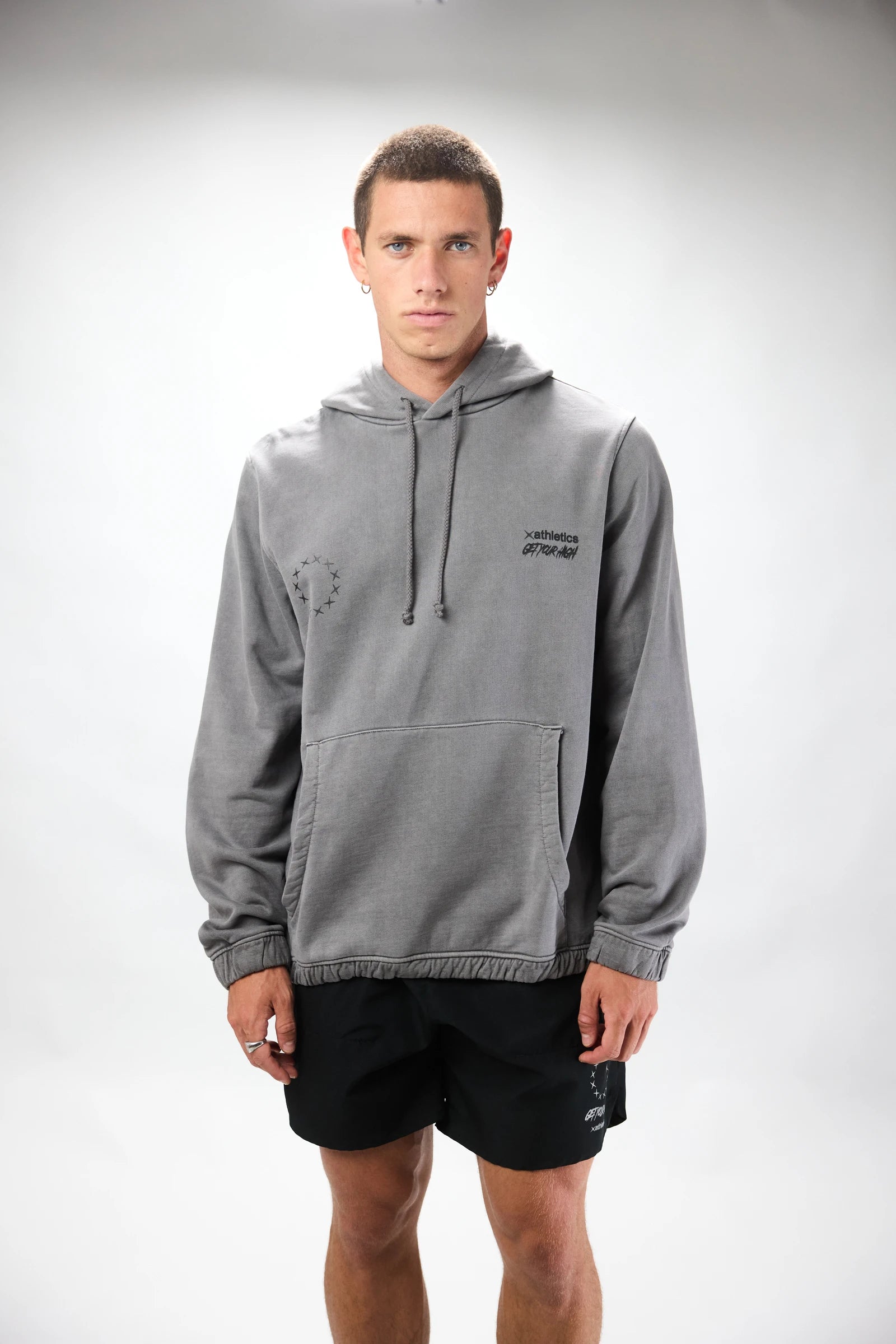 Washed effect hoodie made of 100% cotton. Elastic adjustable hem at the waist. Kangaroo pocket with zippers. Logo on the central front and central back.