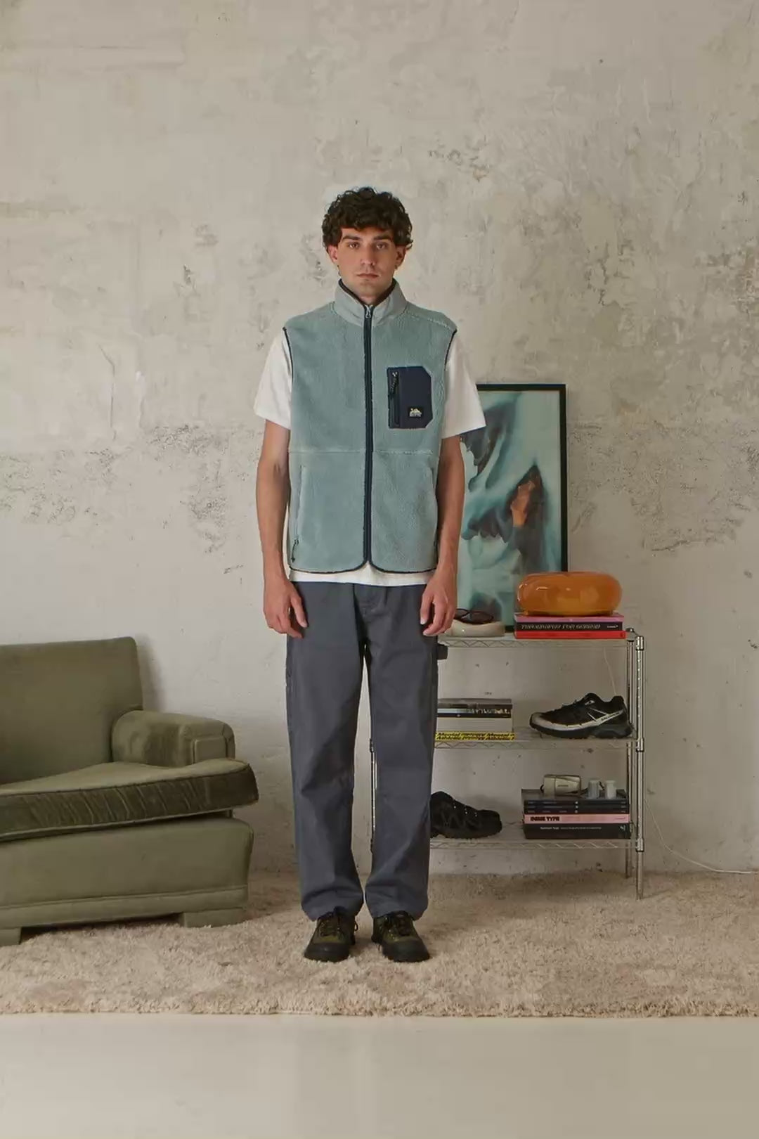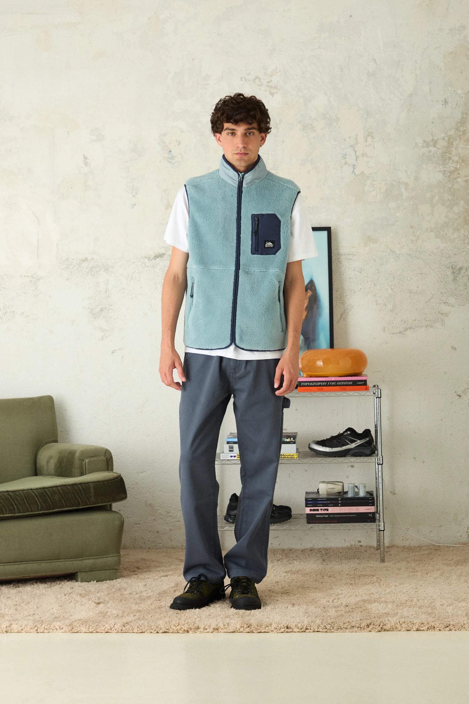 Polyester and sherpa vest, warm, versatile, and with functional pockets.