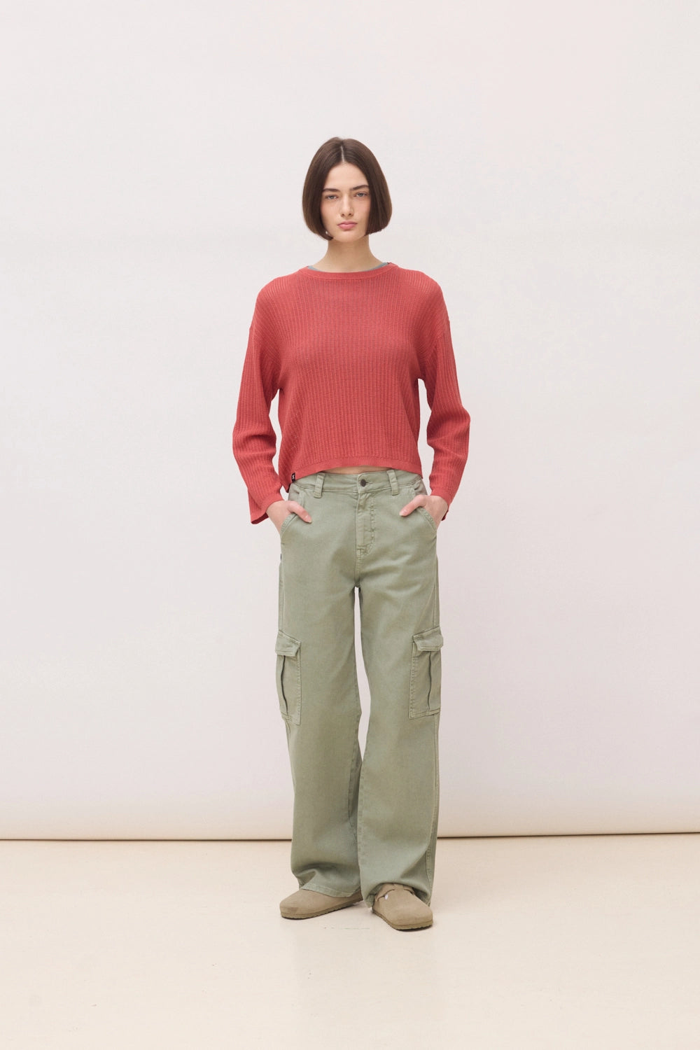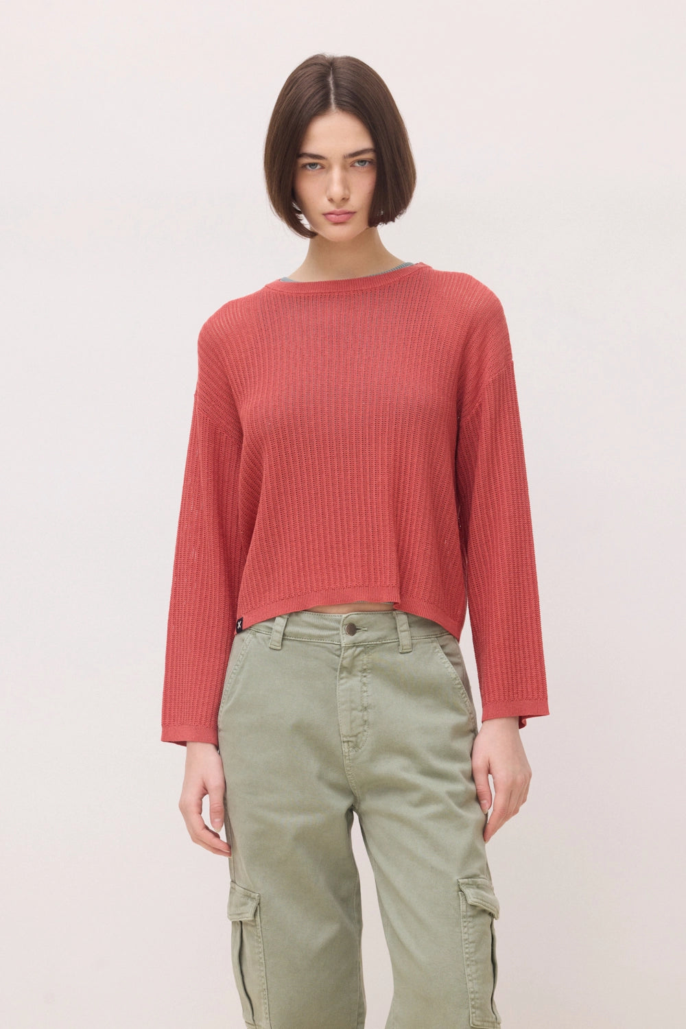 Jersey de punto calado con estructura de canalé. Hombro caído. Cuello redondo con acabado en punto liso. Parche de logo en bajo izquierdo y corte oversize.