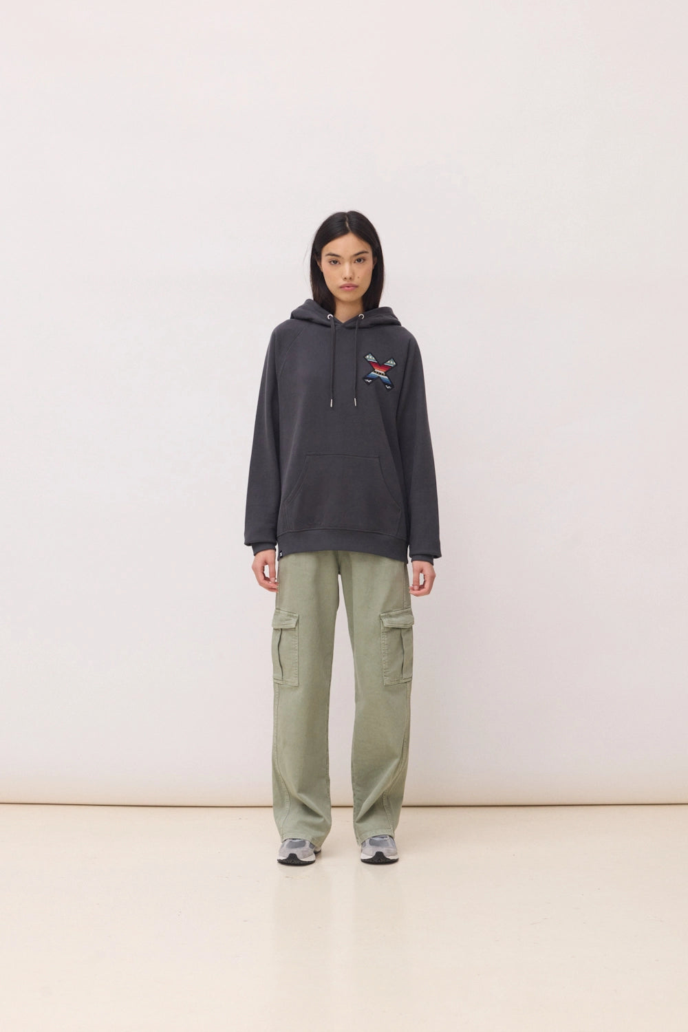 Hoodie avec notre classique X brodée : devant sur la poitrine et à l'arrière sur le dos. Poche centrale inférieure à l'avant avec une ouverture des deux côtés. Fabriqué en 100% coton biologique et coupe regular fit.
