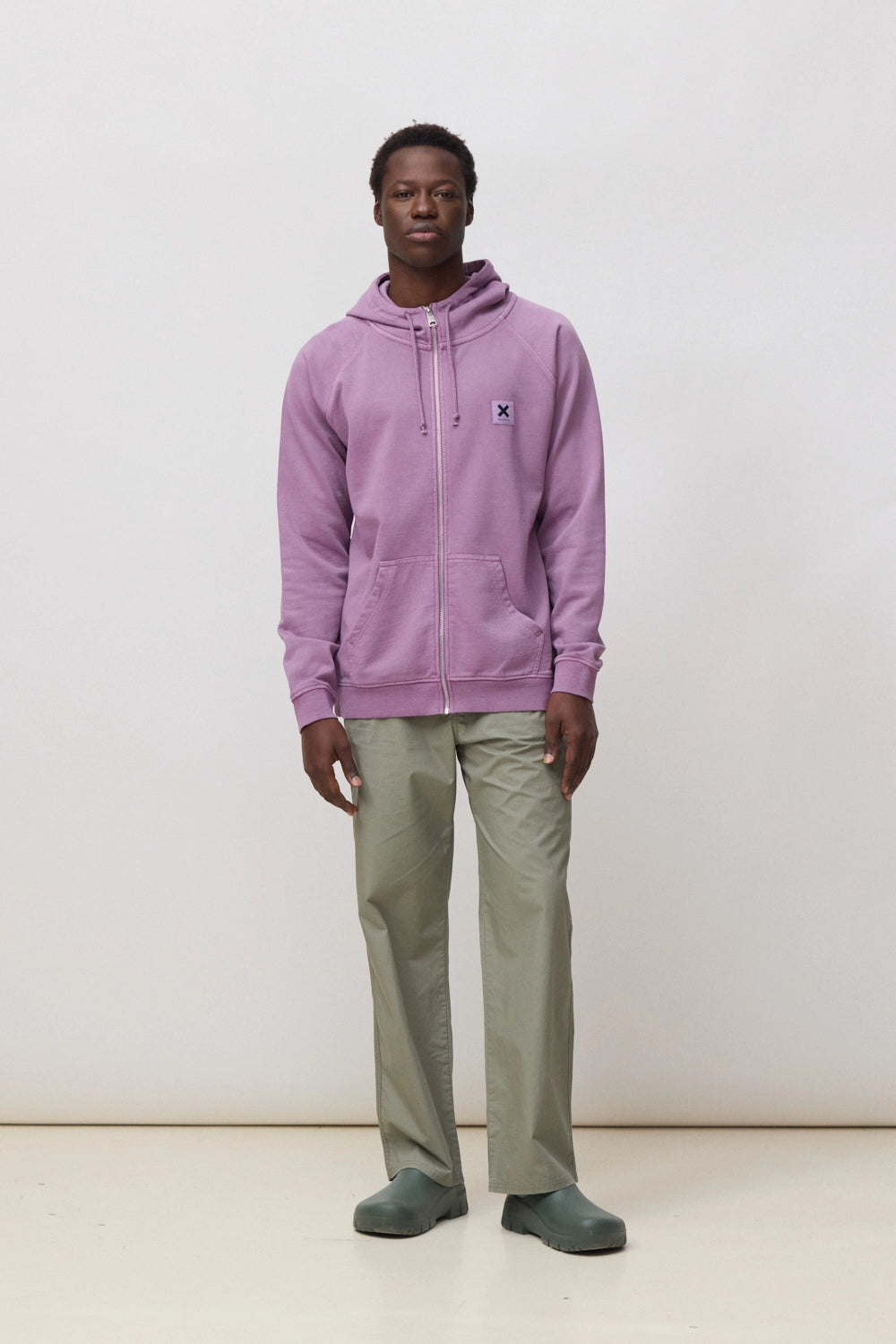Sudadera efecto lavado con capucha con cremallera central. Logo en etiqueta tejida. Confeccionada con 100% algodón orgánico. Corte regular fit y gramaje: 400 GSM.