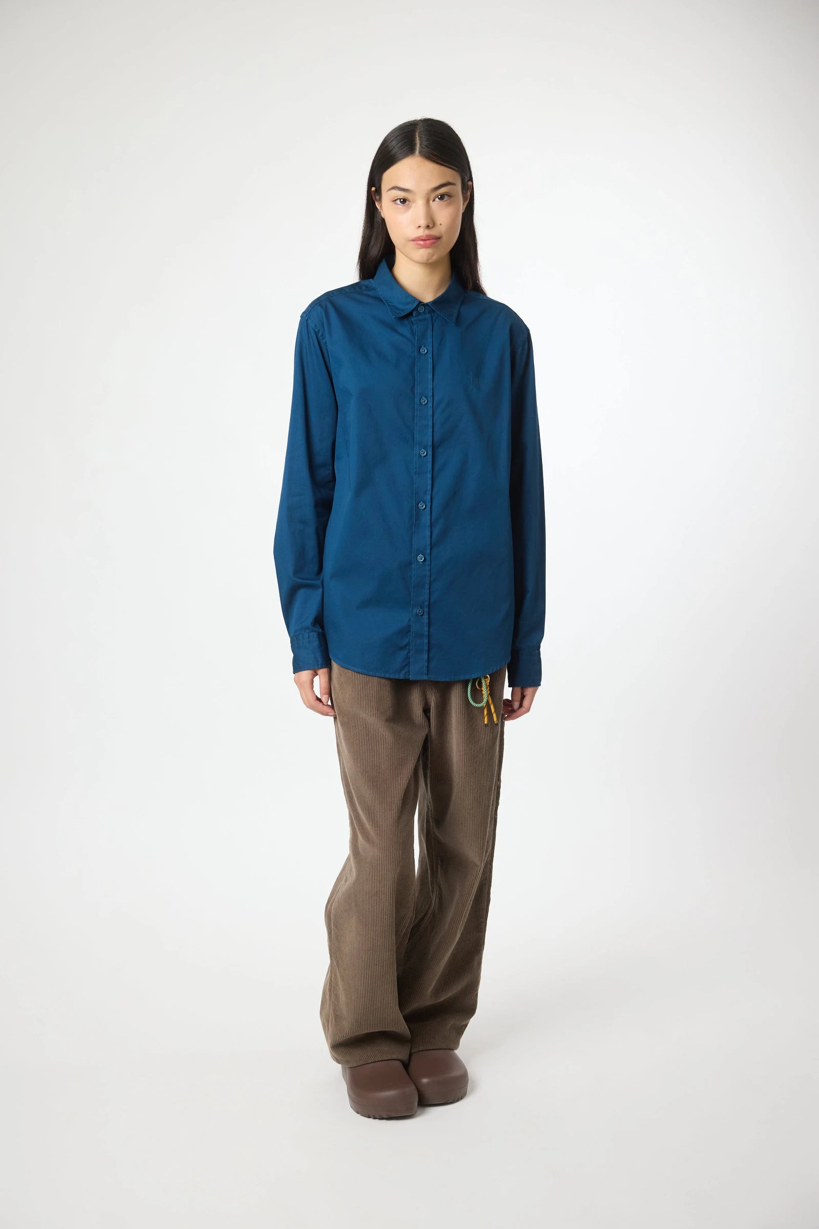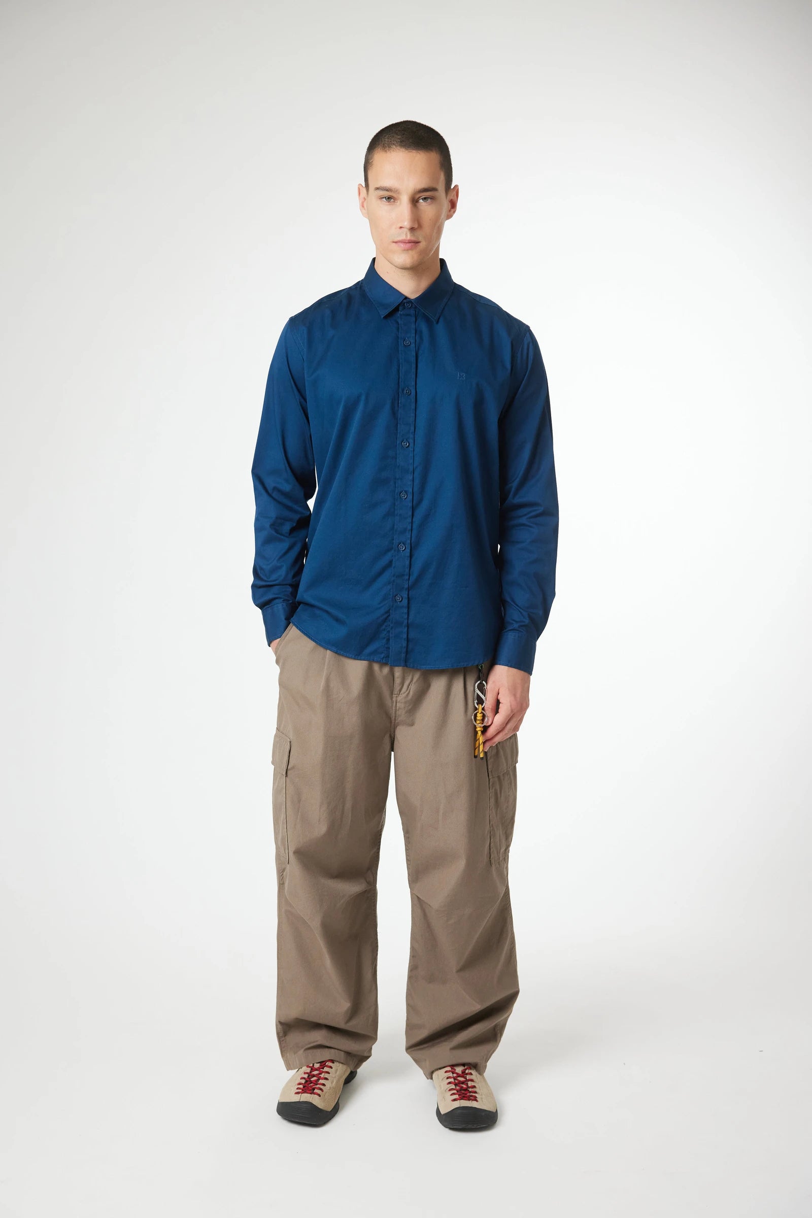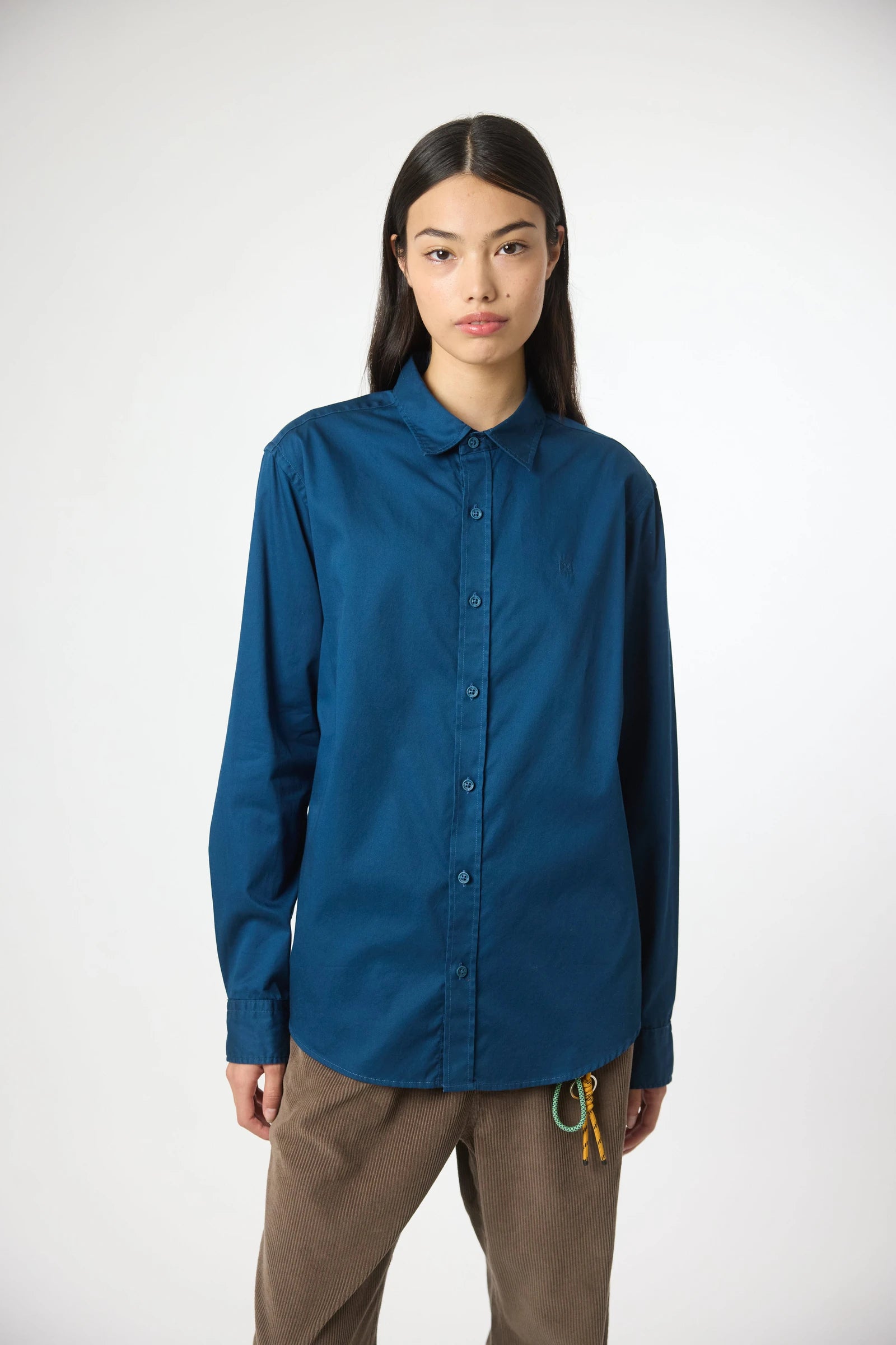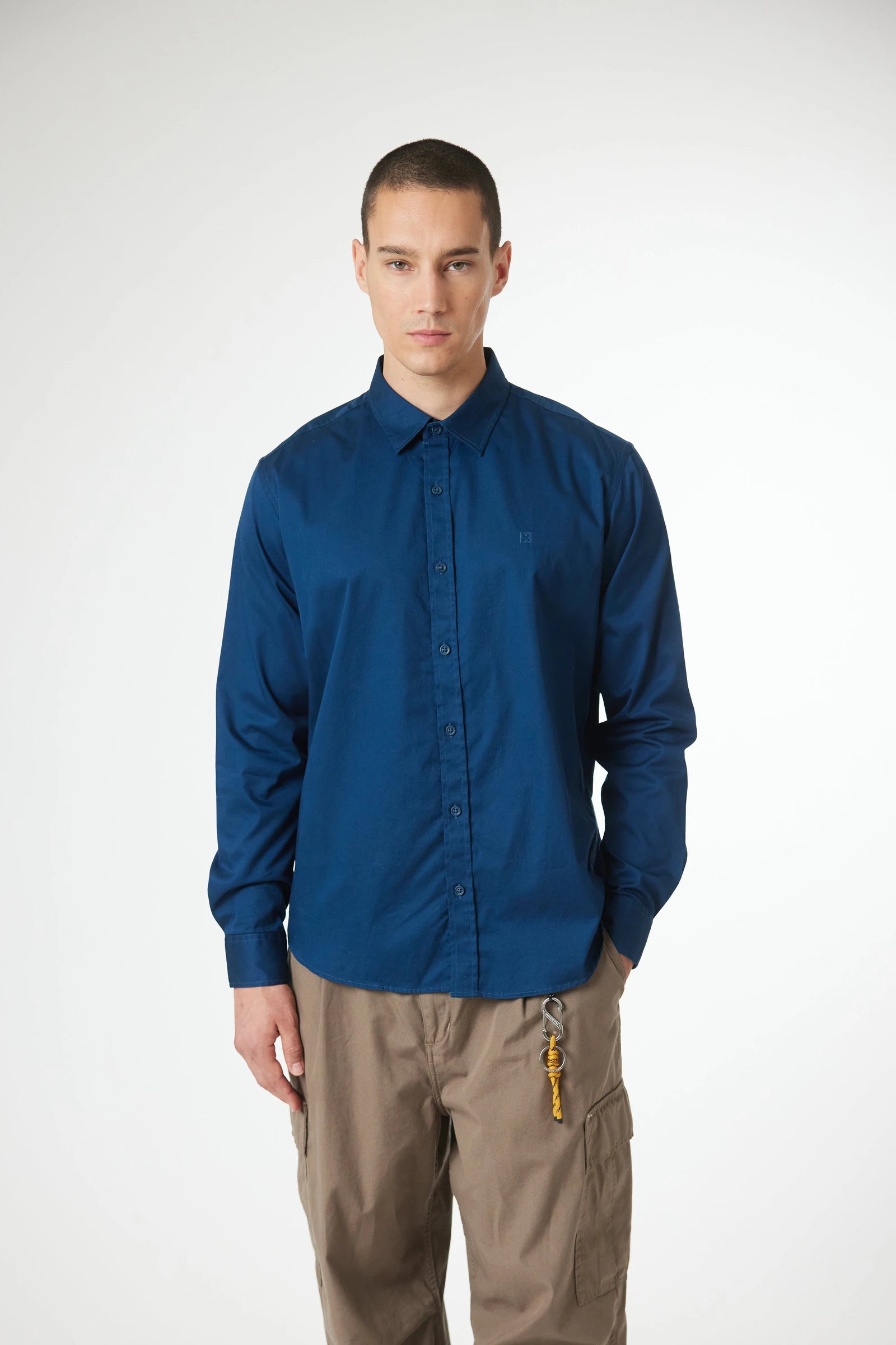 Chemise à manches longues, 100% coton. Motif décoratif brodé sur la poitrine. Boutons personnalisés. Étiquette de marque sur la patte du poignet.