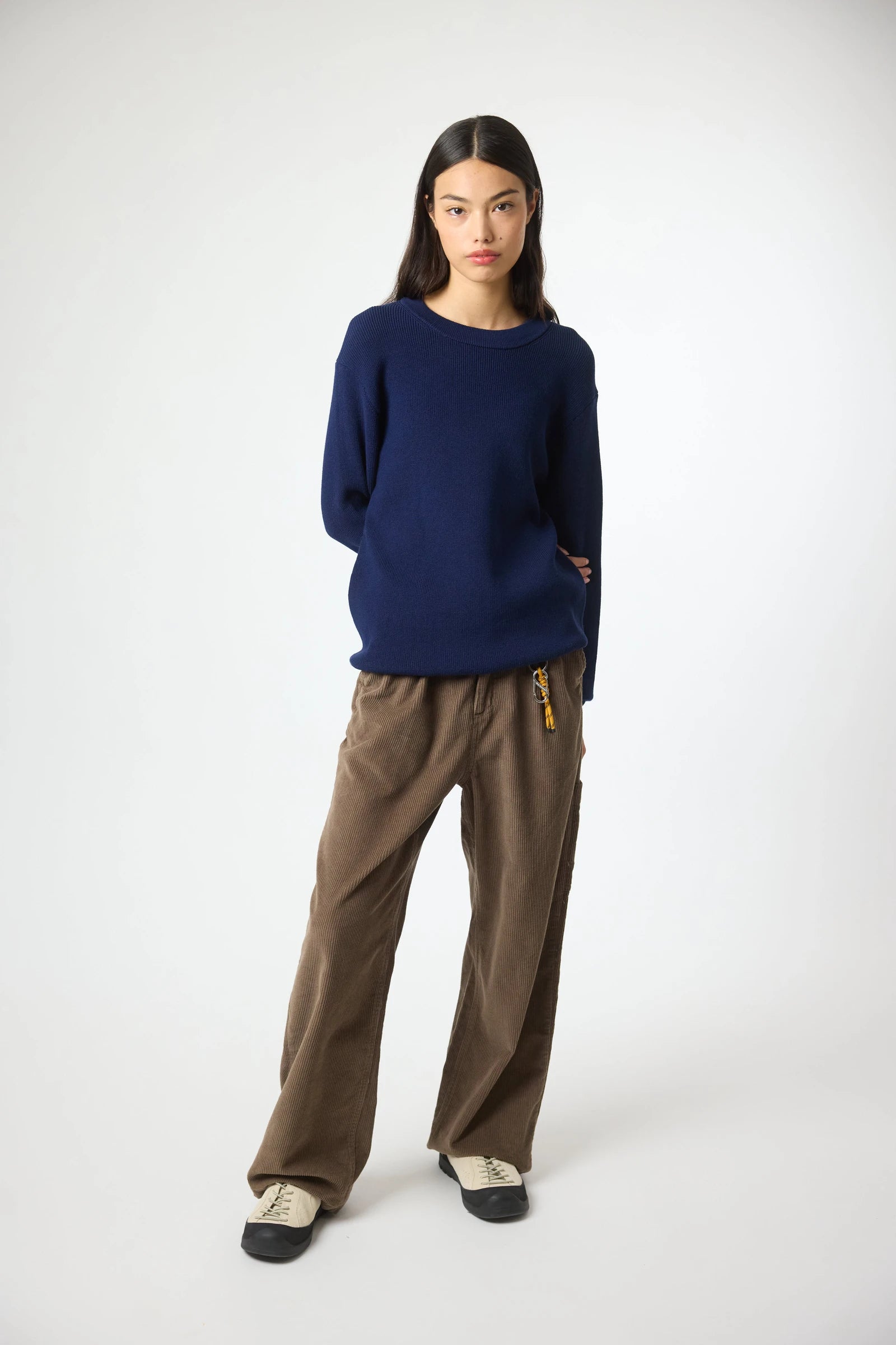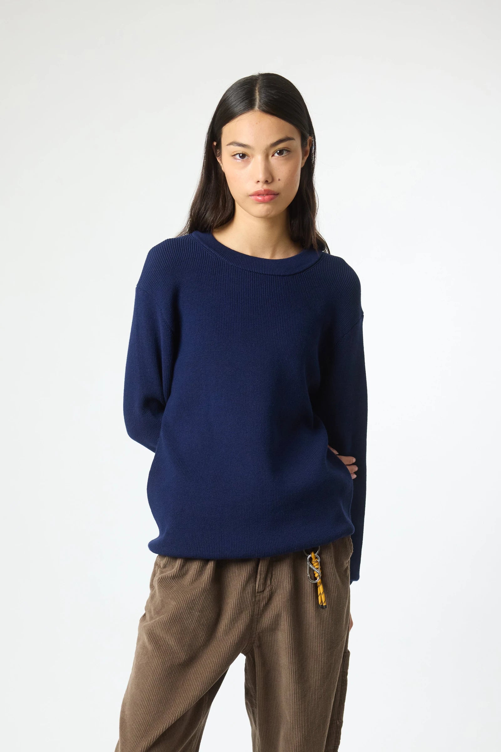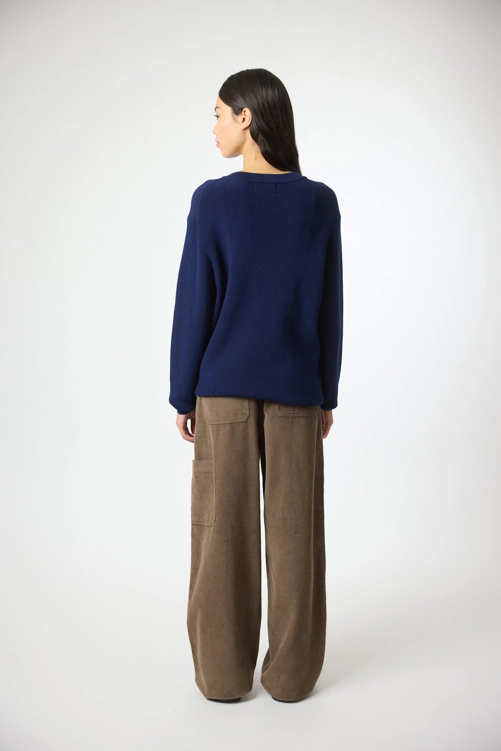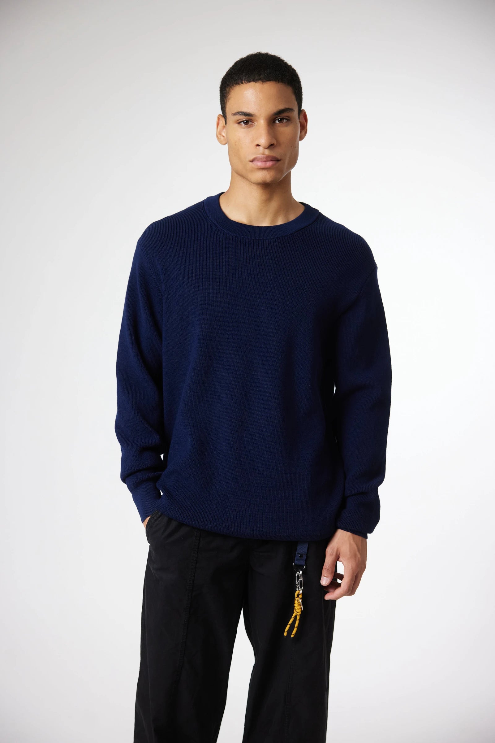 Pull en maille côtelée, confectionné en coton. Col rond et finitions en bord-côte. Étiquette décorative de marque en bas.