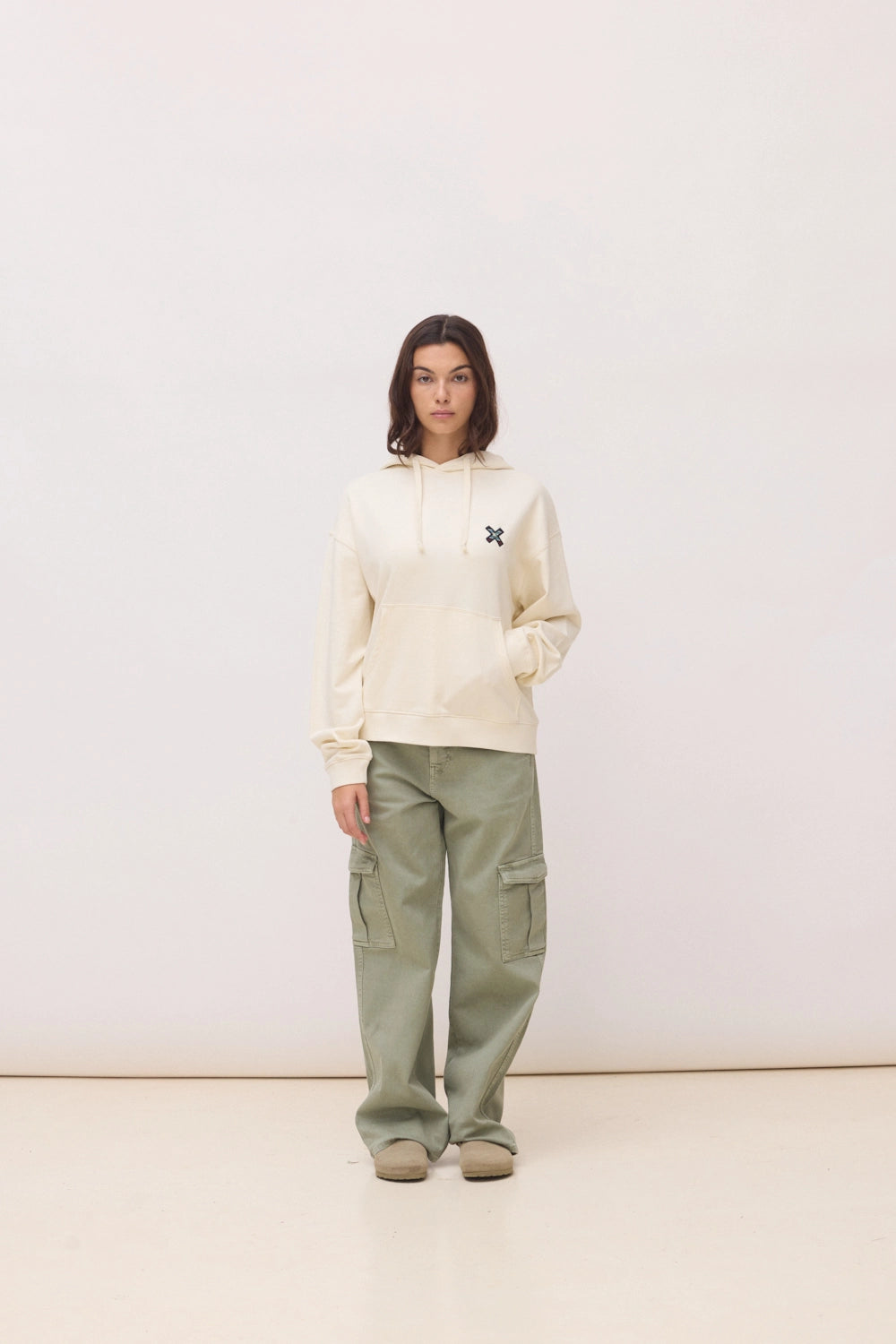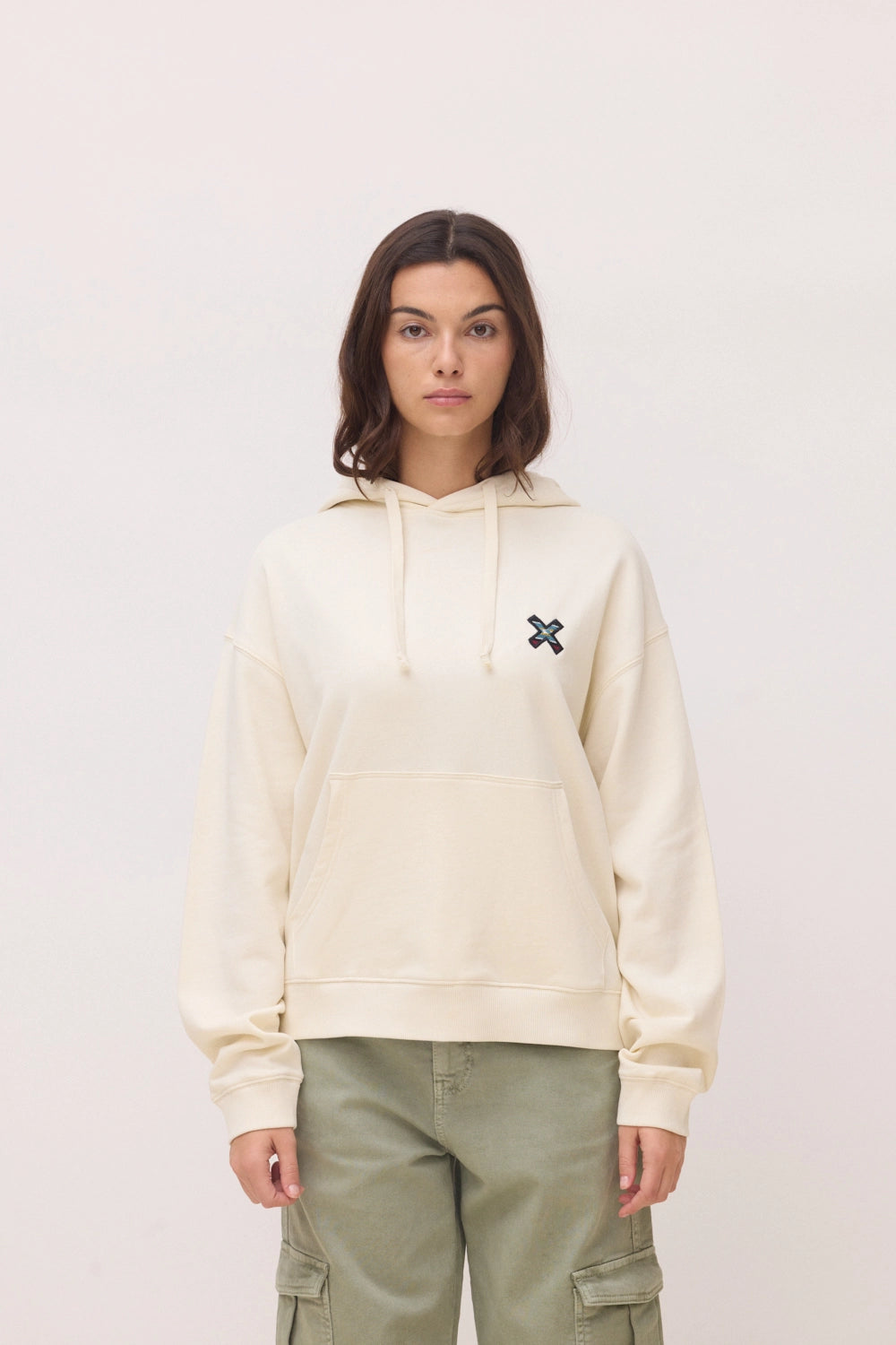 Sweat à capuche avec notre X classique sur la poitrine et dans le dos. Poche frontale centrale inférieure avec ouverture des deux côtés. Confectionné en 100% coton biologique.