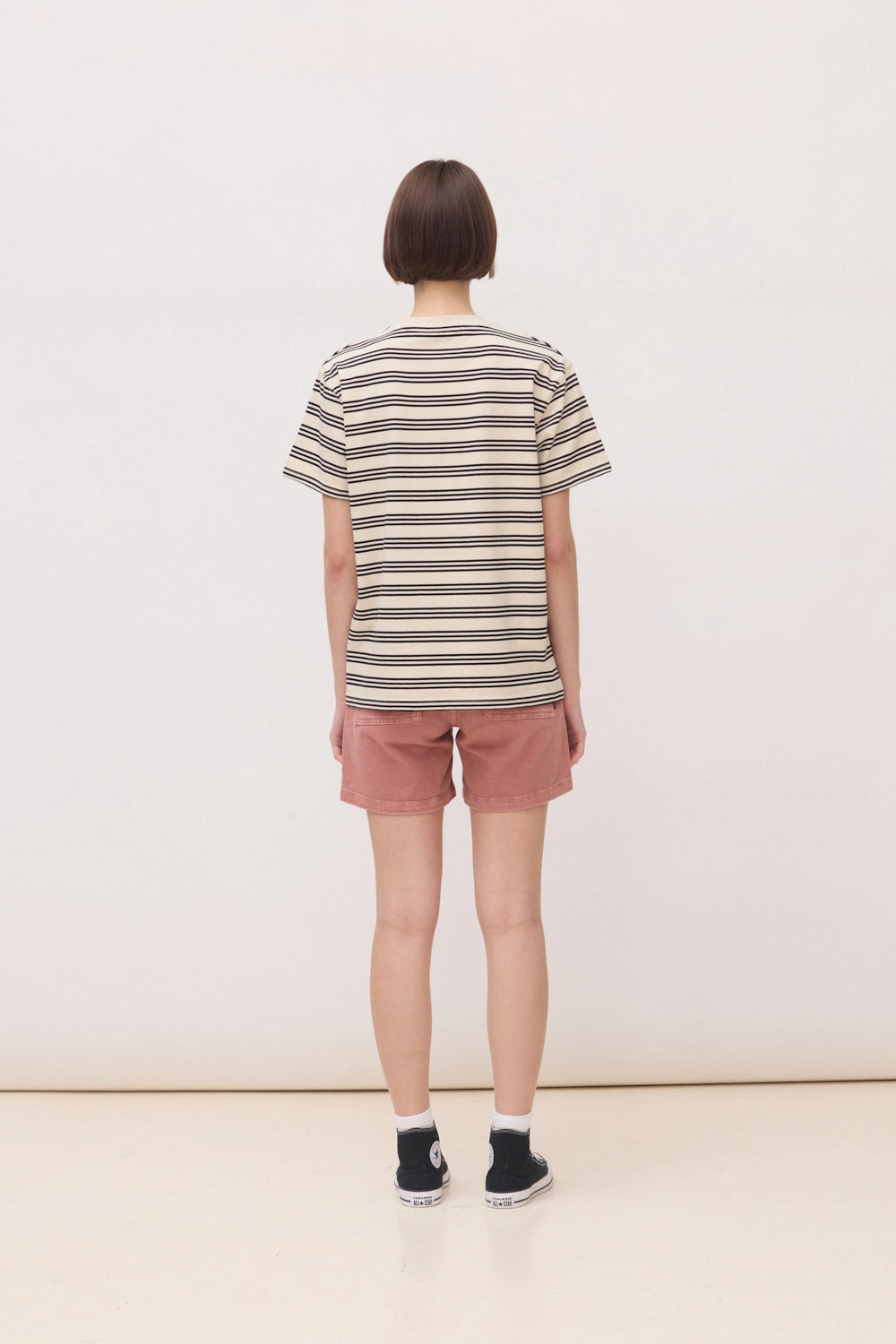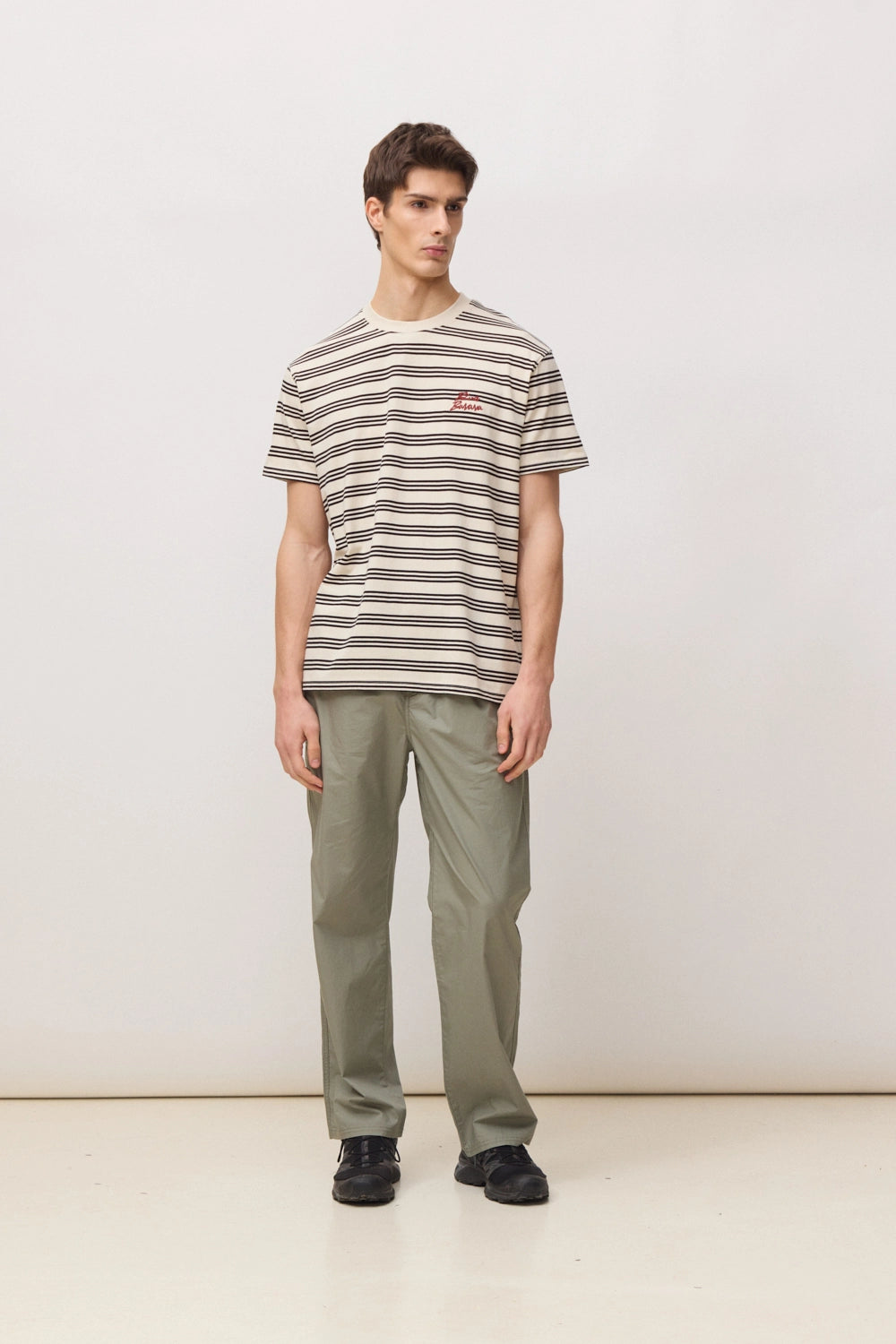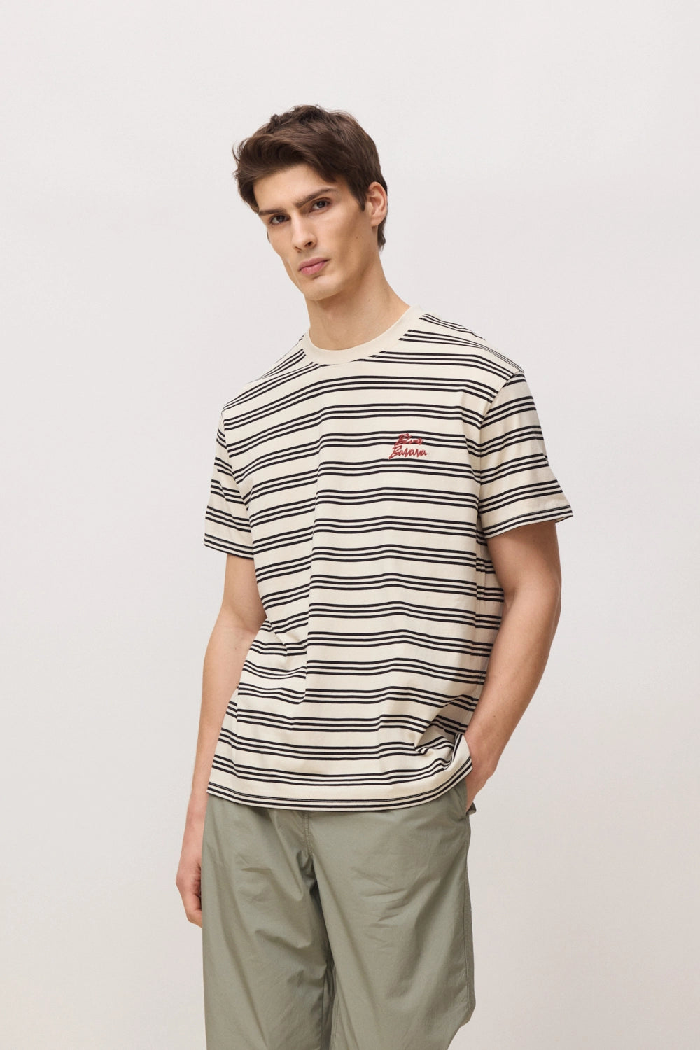 Camiseta a rayas con bordado delantero en la parte del pecho. Confeccionada con 100% algodón orgánico. Corte regular fit y gramaje: 200 GSM.