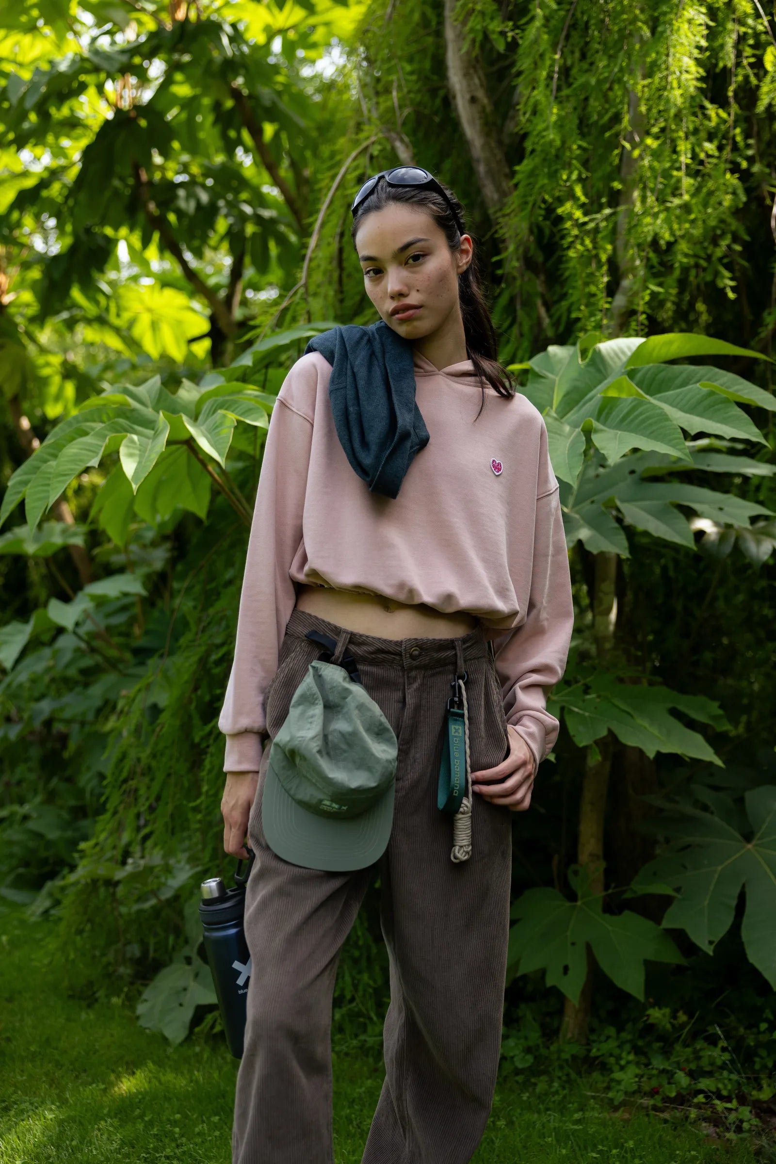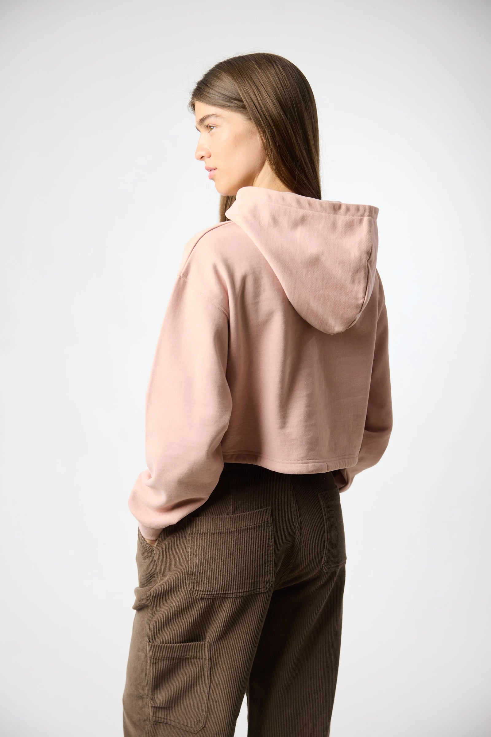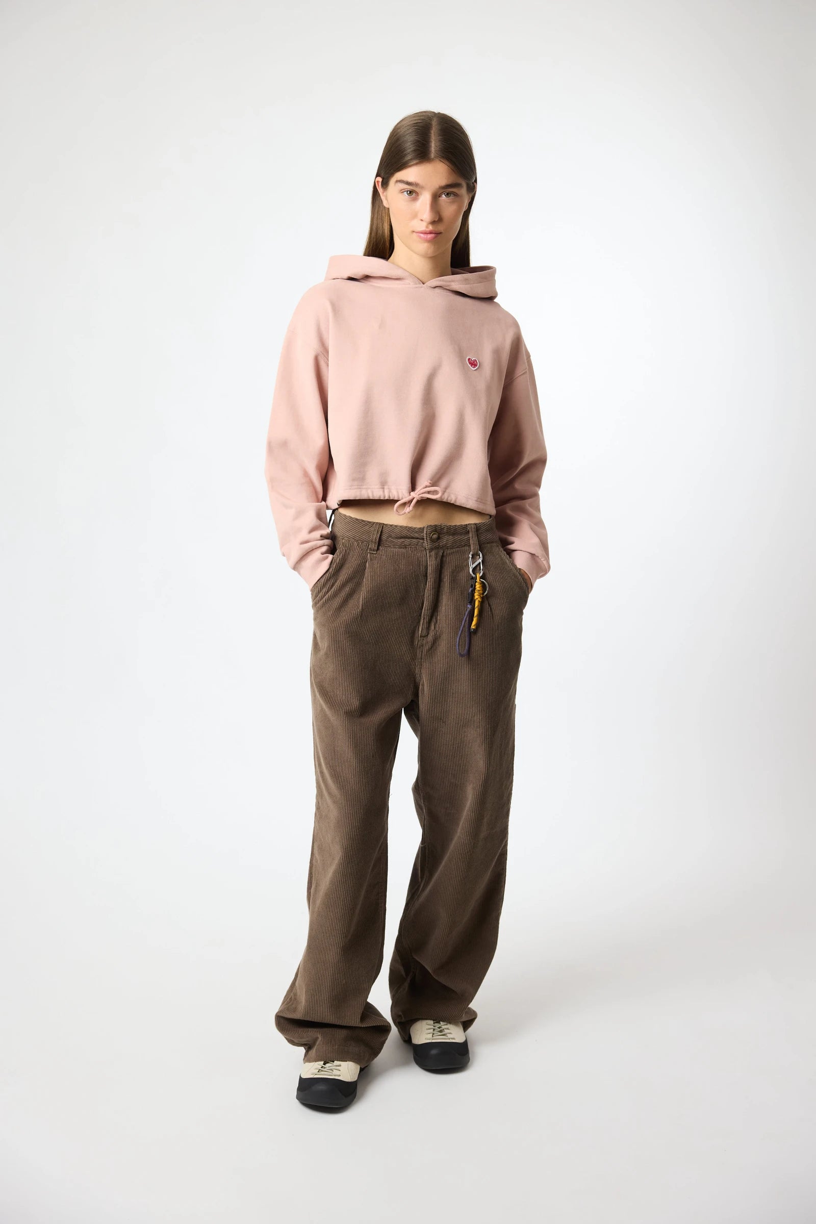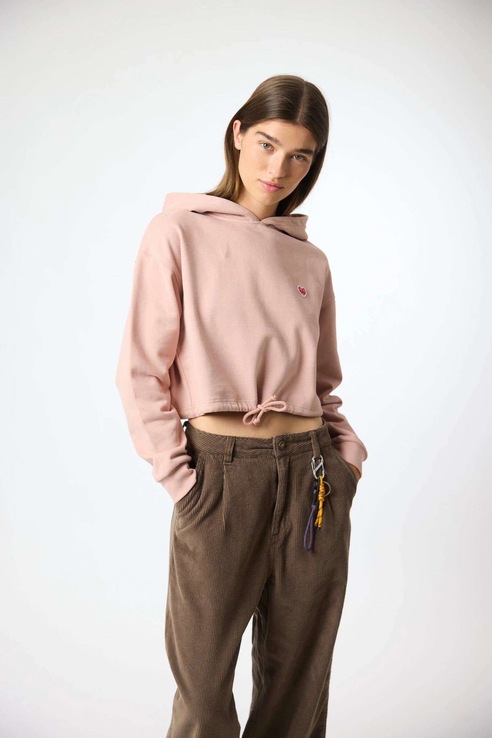 Sweat à capuche avec écusson décoratif sur la poitrine. Poche frontale inférieure avec ouverture des deux côtés. Confectionné en coton 100% biologique et coupe crop.