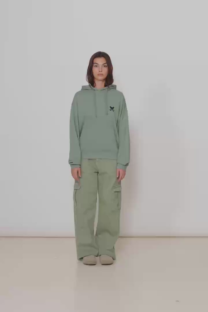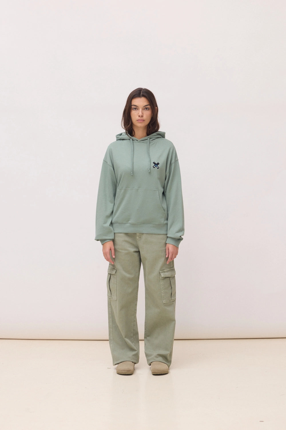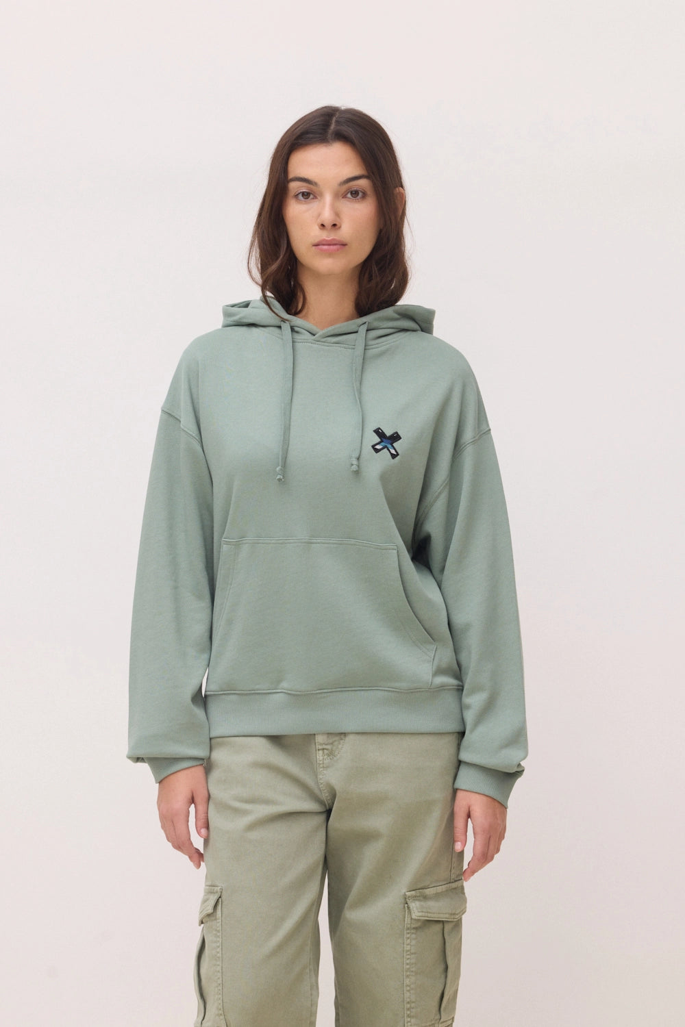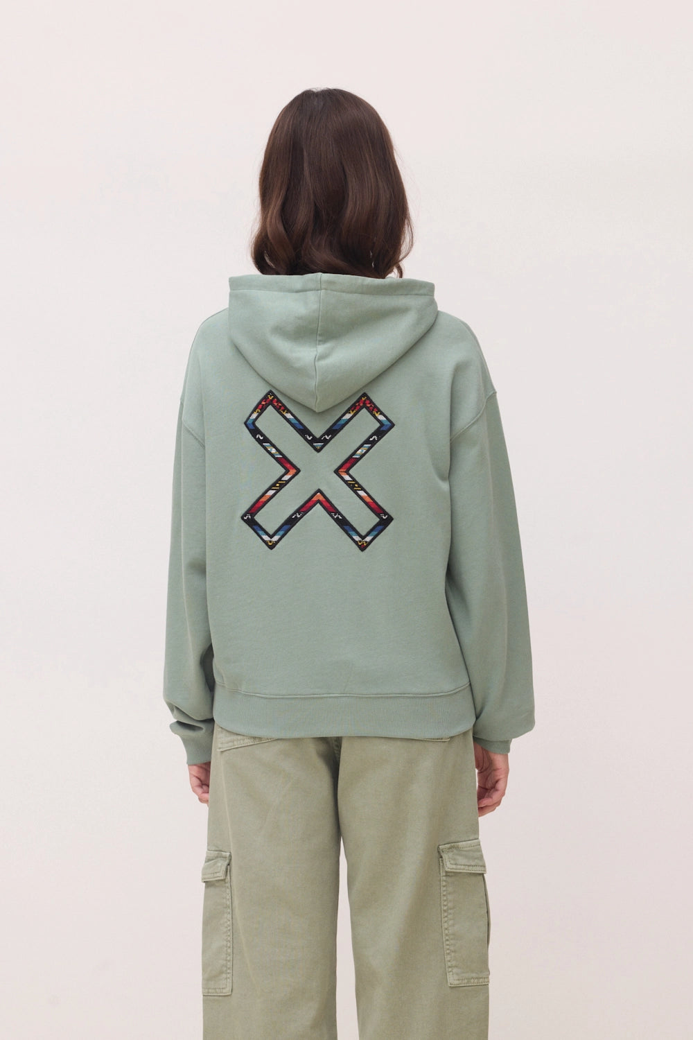 Sudadera con capucha con nuestra clásica X en el pecho y en la espalda. Bolsillo delantero central inferior con apertura en ambos lados. Confeccionada con algodón 100% orgánico.
