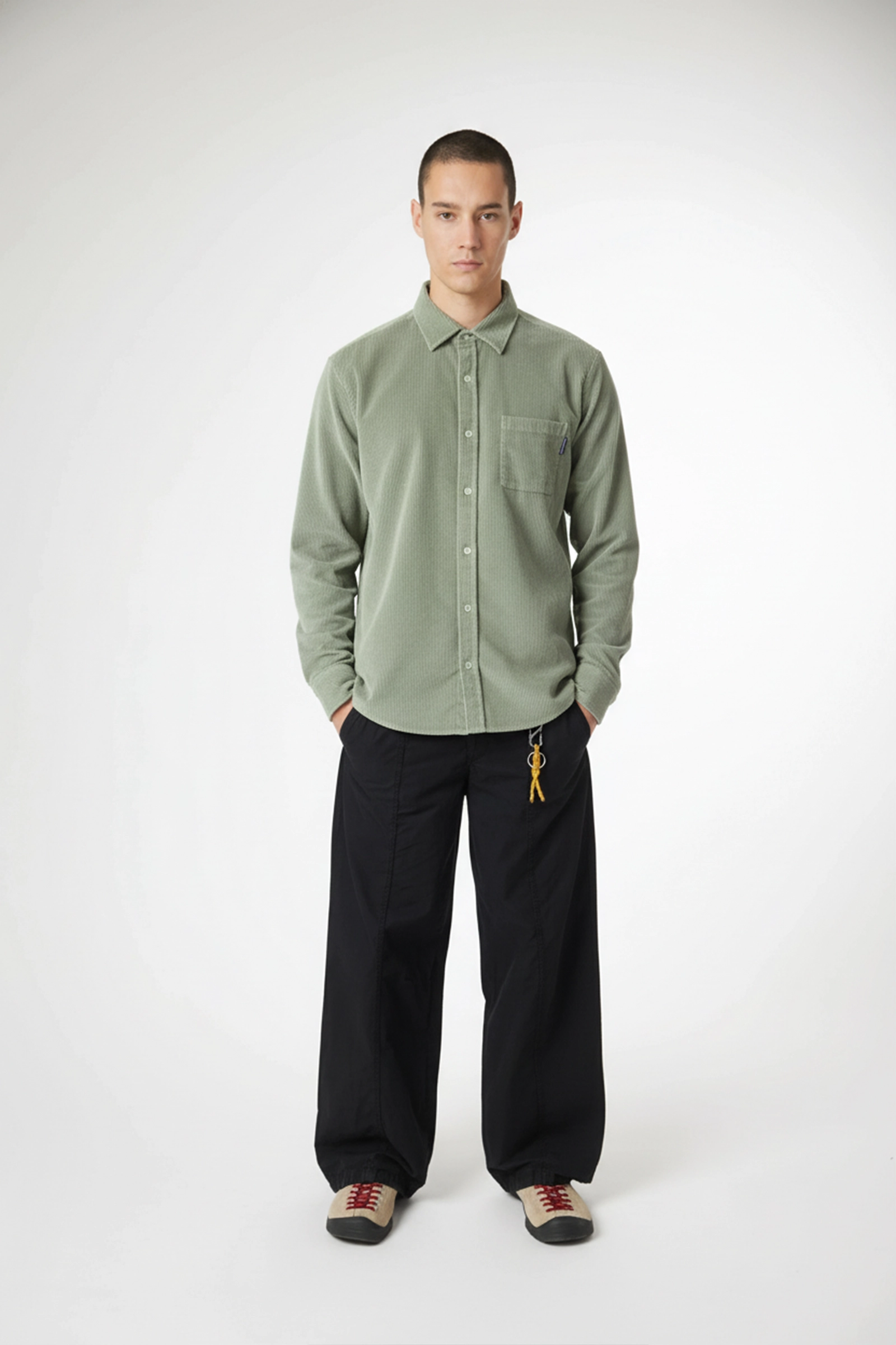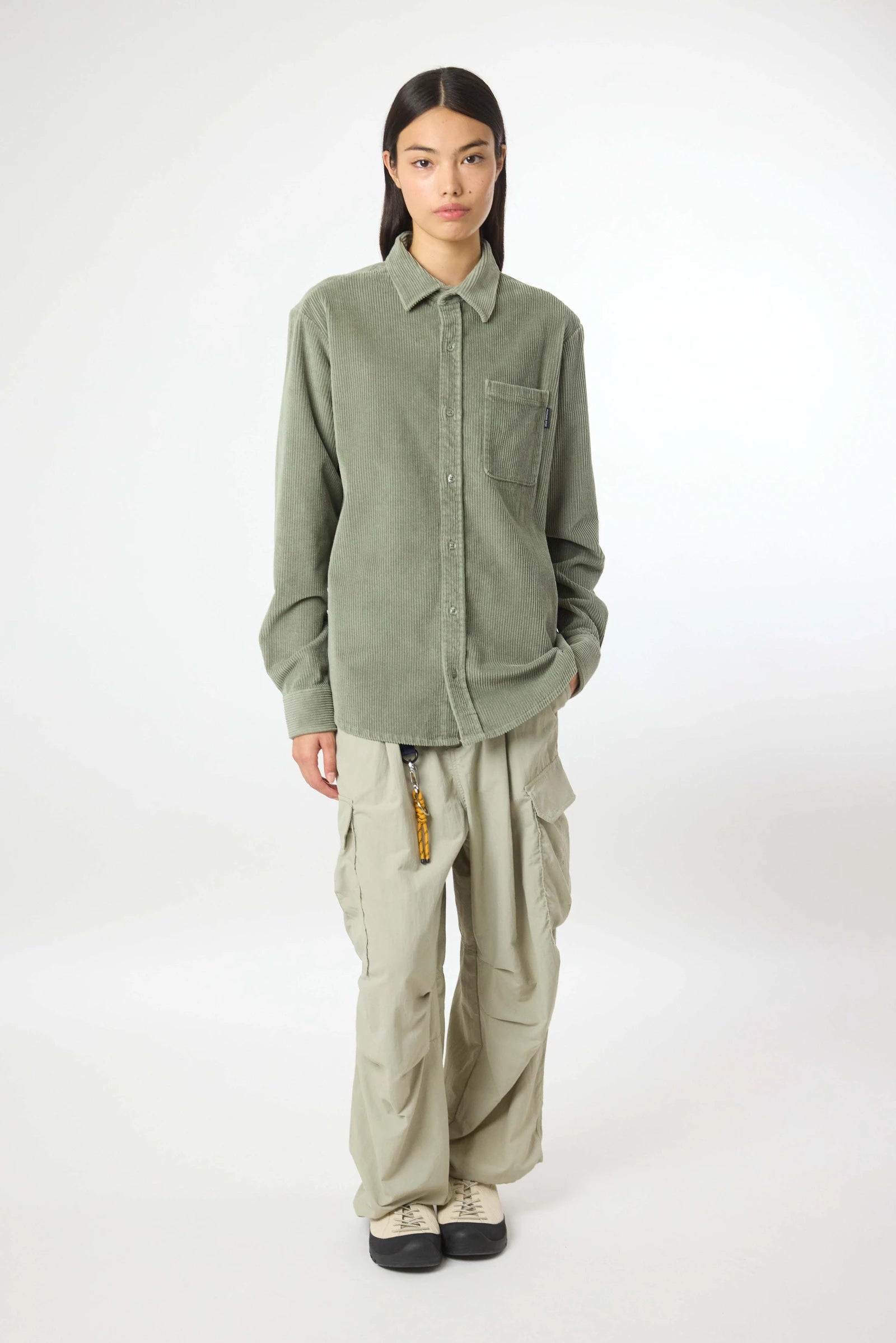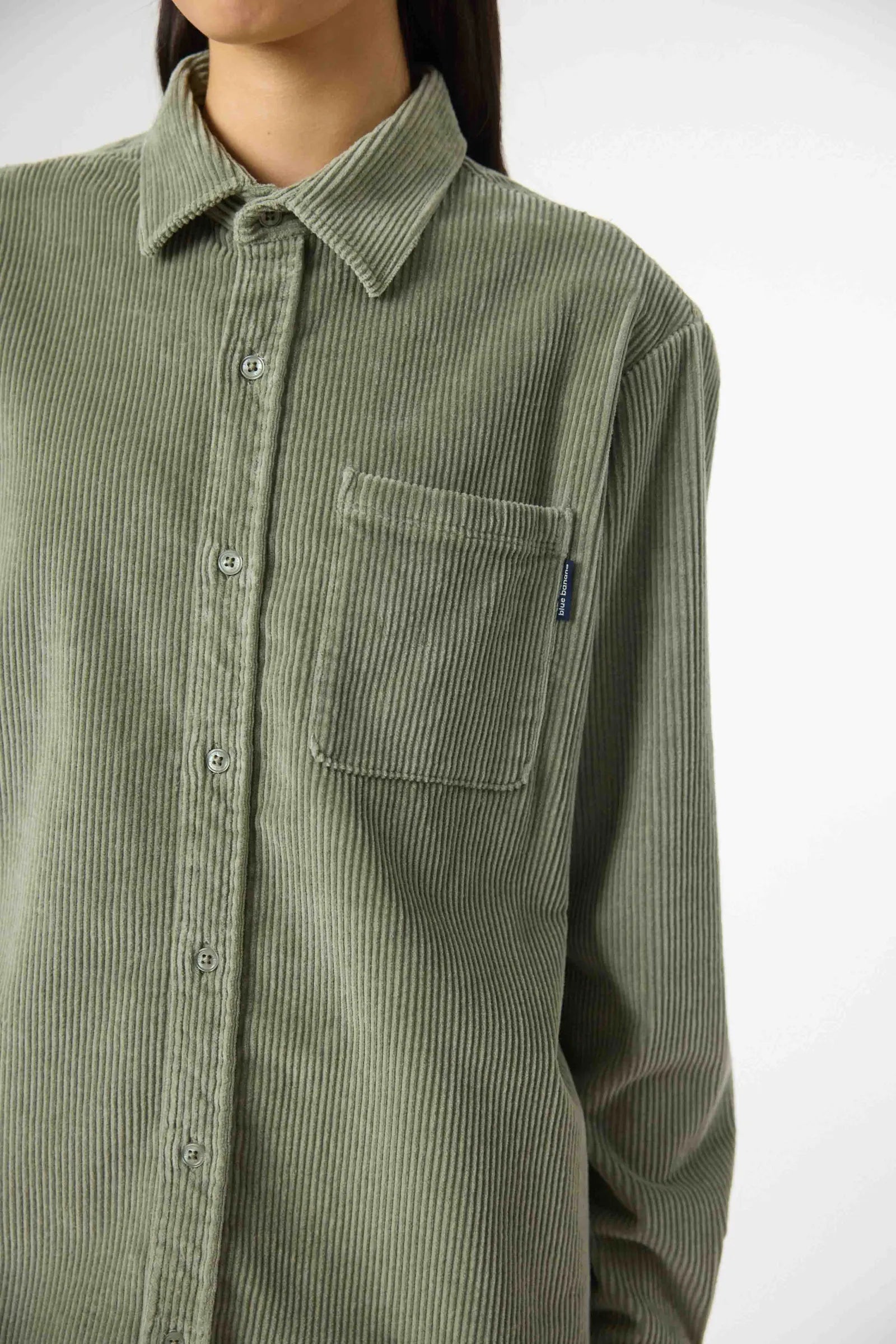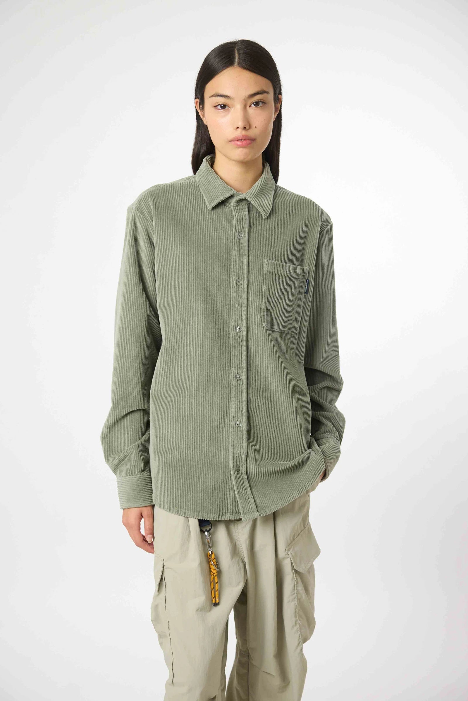 Surchemise à manches longues, en tissu velours côtelé de coton. Coupe décontractée. Une poche plaquée sur la poitrine. Boutons personnalisés. Étiquette de marque sur la poche avant.
