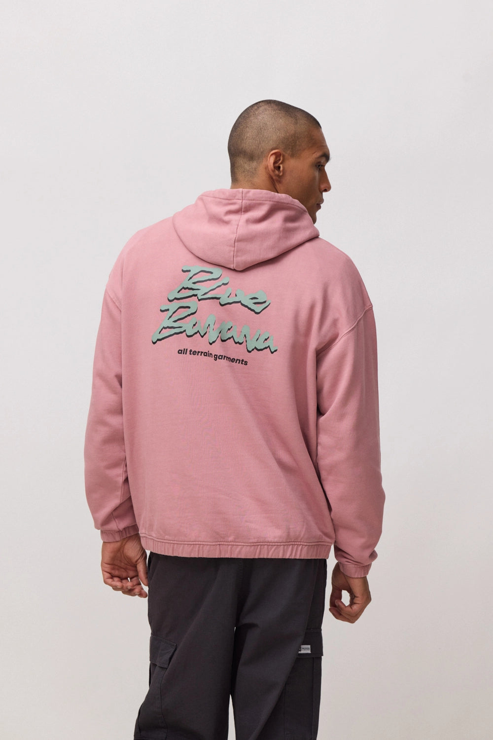 Sweat à capuche avec imprimé à l'avant en haut à gauche et imprimé central au dos avec coupe oversize.